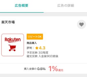 こちらはモッピーの例ですが、キャンペーン中で1%とハピタスと同じ還元率ですが、通常は0.5%とハピタスの半分の還元率となります。